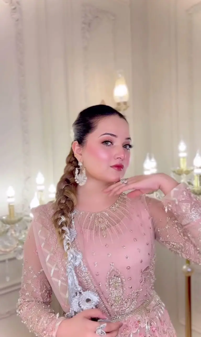 For her special day, Rabeeca Khan looked ethereal in a peach-pink heavily embroidered gown. The intricate silver embroidery and embellishments made her outfit a true showstopper. She paired the dress with a beautifully styled braid adorned with a silver Paranda, adding a traditional yet trendy touch to her look.